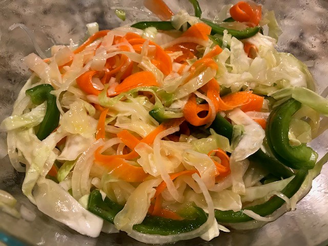 Step 1: In a large bowl, toss together the cabbage, onion, carrot, green pepper, and cucumber.