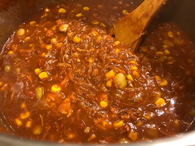 Step 5: Add the pulled chicken and pulled pork to the pot and stir to coat the meat in the sauce. Cover and cook for 10 minutes, stirring occasionally.