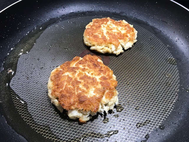 Step 4: Once chilled, place a large non-stick skillet over medium-high heat. When the pan is hot, add the vegetable oil. When the oil starts to shimmer, carefully add the crab cakes and cook until golden brown, 3-4 minutes.
