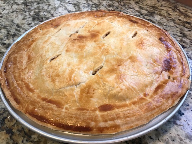 Step 5: Cover the pie with the 1 layer of pie dough, being sure to press down the outer crust. Cut several small holes in the pie dough for vents.