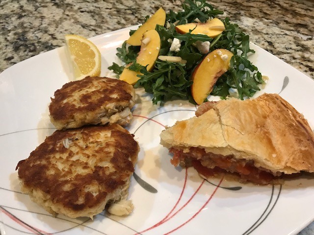 Trip #7 Maryland (Northeast) Baltimore Crab Cakes, Chesapeake Tomato Pie, Arugula Salad with Nectarines and Goat Cheese