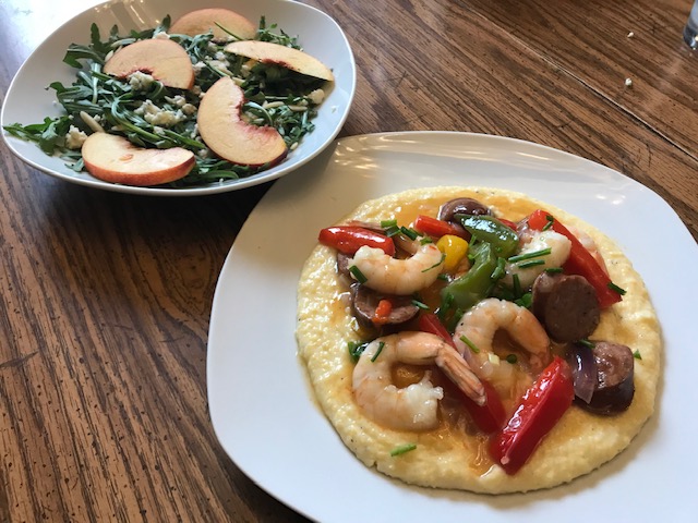 South Carolina was an easy one. This is where I have lived for the vast majority of my life, and nothing says the low country of South Carolina quite like a hot plate of shrimp and grits! It is the official state meal, after all. However, this delicious dish seems to celebrate only the small, coastal potion of the Palmetto State. So, I also get to explore the flavors of the Upstate with a salad that features SC grown peaches and Clemson Blue Cheese! It’s a tale of two parts of the state that I call home.