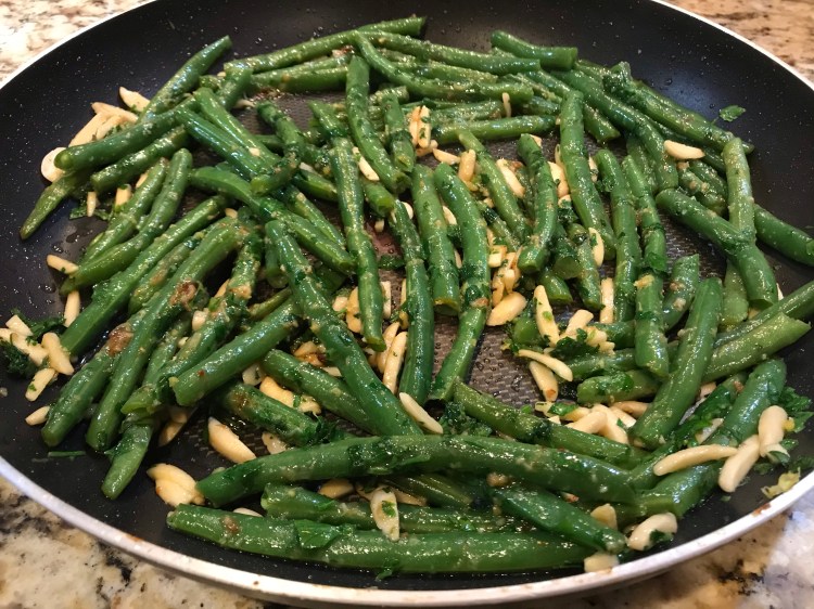 Step 4: Add the cooled beans and stir to thoroughly coat the beans in the garlic oil. Add the parsley, lemon zest, and almonds to the beans. Cook for 1 minute, constantly stirring to combine.