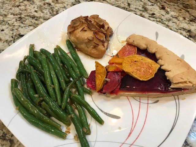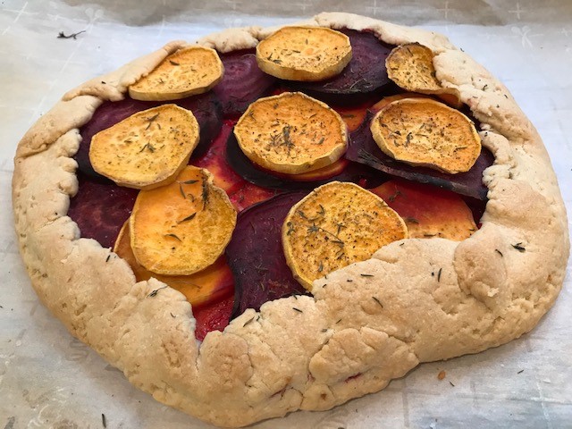 Step 6: Spread the room temperate goat cheese evenly on the dough, leaving an untouched 1-inch boarder of dough around the outside edge. Alternate slices of beet and sweet potato on top of the goat cheese until you run out of vegetables. Several layers of beets and sweet potato are ok.