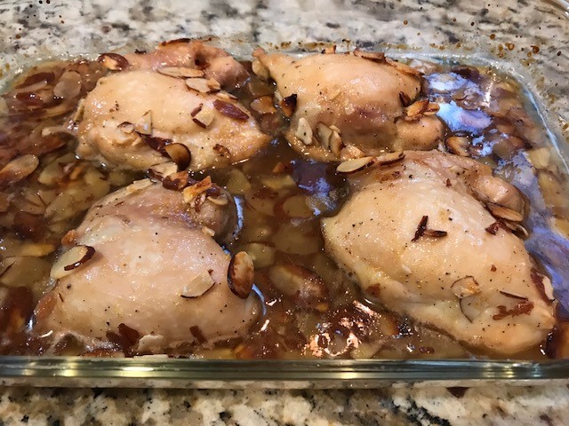 Step 3: In a small bowl, whisk together the melted butter, maple syrup, lemon juice, lemon zest, salt, pepper, and sliced almonds. Once this mixture is well combined pour it evenly over the chicken thighs.