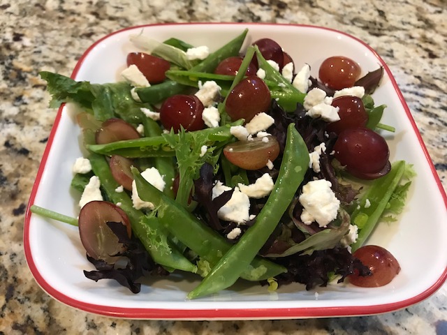 Step 2: Gently toss together the salad greens, sugar snap peas, red grapes and feta until mixed.