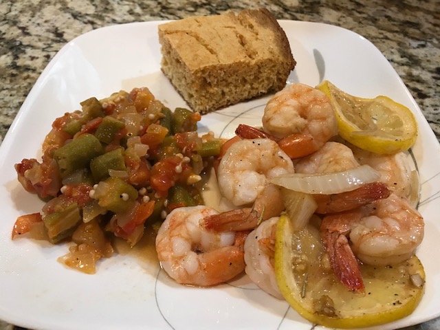 “Anyway, like I was sayin’, shrimp is the fruit of the sea. You can barbecue it, boil it, broil it, bake it, sauté it. Dey’s uh, shrimp-kabobs, shrimp creole, shrimp gumbo. Pan fried, deep fried, stir-fried…” Isn’t that the truth! Those words from Bubba Blue to Forrest Gump in the wildly popular movie of the same name ring true to any fan of the tasty shellfish. Besides winning many an Oscar, the movie Forrest Gump also launched a very successful chain of seafood restaurants around the world called the Bubba Gump Shrimp Company. It is from their cookbook that we get our Alabama Shrimp Bake, a delicious and EASY seafood creation with fresh lemons and a tasty butter-based sauce! Add some slow cooked okra and tomatoes and a side of southern style cornbread for dipping, and you have a meal fit for a king! Or, at least a shrimp boat captain.