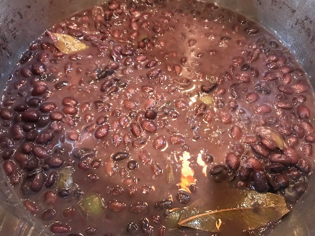 Step 2: Once the vegetables have softened, add the soaked and drained black beans, bay leaves, water, salt, pepper, and bacon. Bring the water to a boil. Once boiling, reduce the heat to low, cover, and simmer for 2 hours. If the beans become dry, add more water, as necessary.