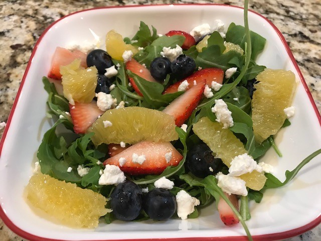 Step 2: Divide the arugula, fruit and goat cheese evenly among 4 salad bowls.