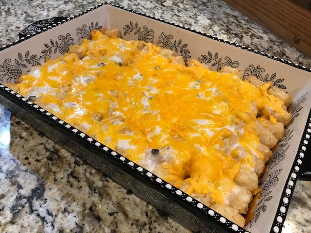 Step 5: Covered the meat with a layer of frozen taster tots.