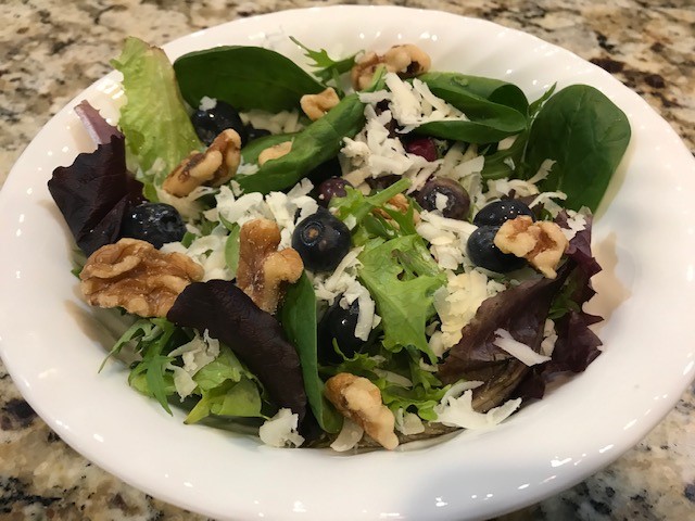 Step 2: Divide the salad greens evenly into 4 bowls. Top each salad with blueberries, shredded cheese, and walnuts.