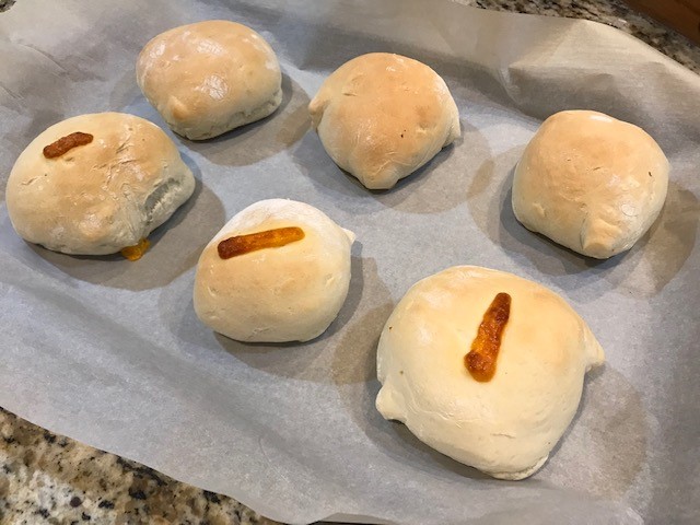 Step 10: Place 1/2 cup of filling into the center of a dough square and add some shredded cheese on top if you wish. Then, pick up each corner of the dough square and pinch them together, also pinching together the seams so the dough balls are sealed. Place the bierock with the seam side down on the baking sheet. Repeat with the remaining dough squares. (I made 3 with cheese and 3 without cheese. I placed a single shred of cheese on top of each “with cheese” bierock so I could be sure to tell them apart.)