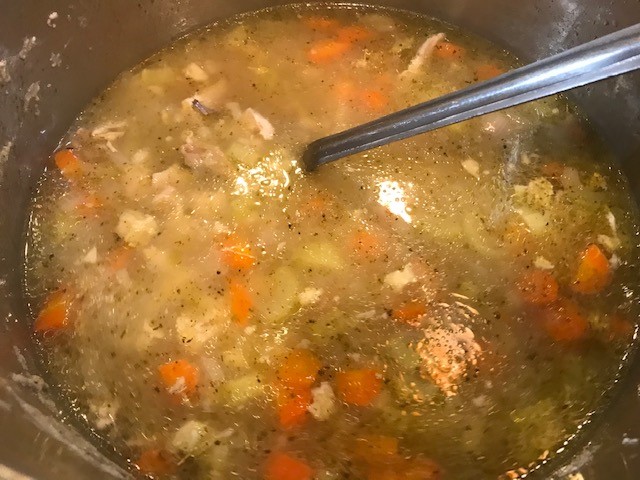 Step 3: Return the meat to the stock and add the carrots, celery, pearl barley, onion, chicken bouillon, bay leaf, poultry seasoning, black pepper, and rubbed sage. Increase the heat to high and bring the liquid to a boil. Once boiling, reduce the heat to low, cover, and cook for 1 hour.