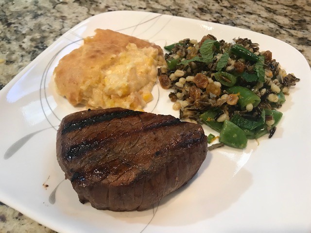 This meal celebrates what makes Nebraska great! There are steaks from the vast ranch land, corn from the fertile farms, and a truly delicious wild rice salad from the first nations of this country. With all 3 you get the sense of the warmth and splendor that must exist in the state of Nebraska. I’ve never been there myself, but after this meal, I think I’ll put it on my list!