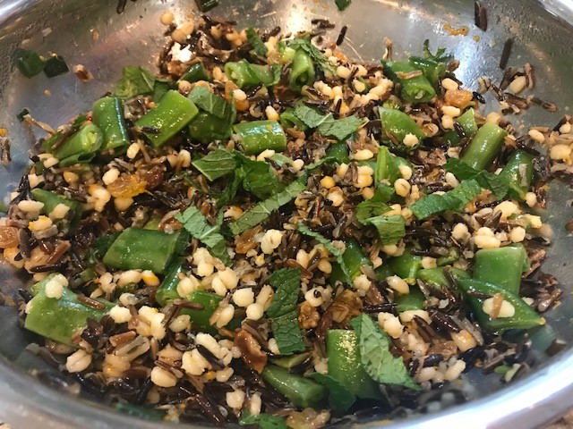 Step 3: Add the pea pods, golden raisins, green onions, orange zest, orange juice, olive oil, salt, and pepper to the cooked rice and stir to thoroughly combine.
