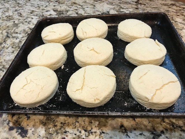 Step 4: Roll the biscuit dough out on a floured work surface to 1/2-inch thickness and cut out the biscuits, round or square. Place the biscuits on a greased baking sheet and place in the hot oven. Bake for 10 minutes, until the bottoms start to get golden brown.