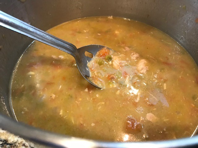 Step 3: Add the chicken broth to the pot and de-glaze with a wooden spoon, scraping up any brown bits.