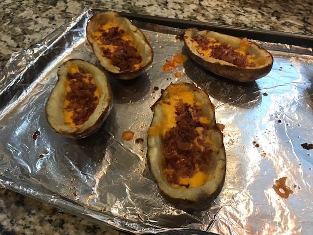 Step 8: Remove the baking sheet from the oven. Stuff each potato skin with 1 Tbs Bacon bits and 1/4 cup shredded cheddar cheese. Put the potatoes back under the broiler and cook until the cheese is melted and bubbling, 5-6 minutes.