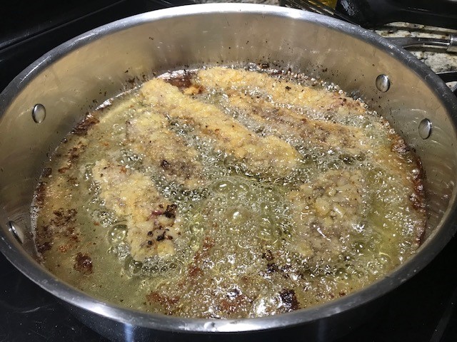 Step 4: Once the oil is hot and the steak has been breaded, gently place the steak strips in the hot oil. Don’t crowd the pan and work in batches, as necessary. Fry for 2 1/2 minutes, adjusting the stove temperature to maintain the oil temperature at 350 degrees. After 2 1/2 minutes, flip the steaks and fry for an additional 2 1/2 minutes.
