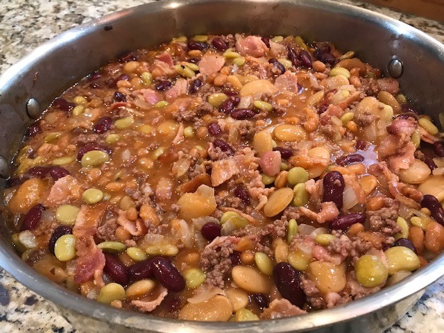 Step 4: Add the pork and beans, kidney beans, lima beans, butter beans, brown sugar, apple cider vinegar, spicy brown mustard, ketchup, and garlic powder to the meat and stir to combine. Once the liquid start to simmer, remove from the stove top and place it in the hot oven.
